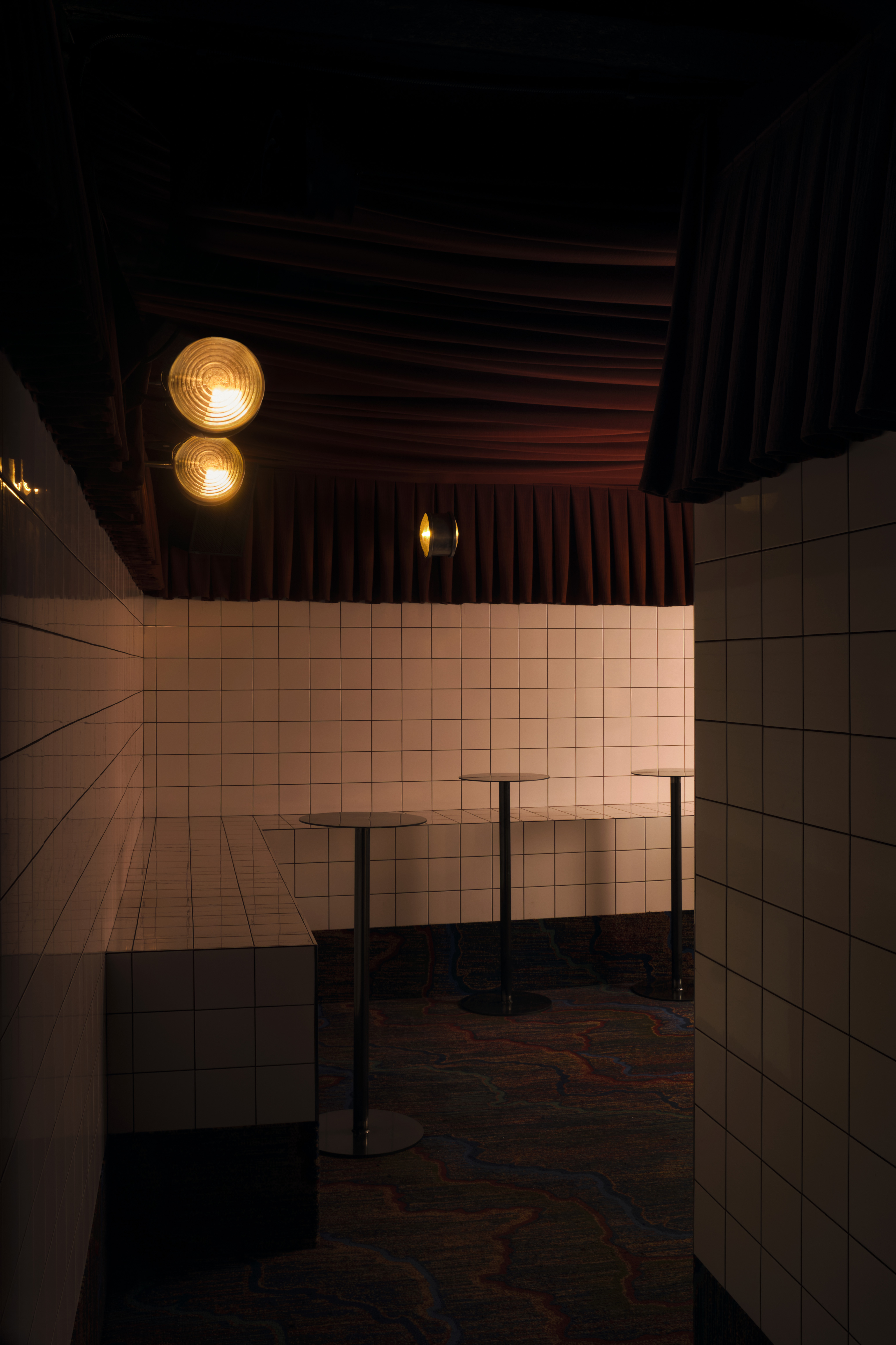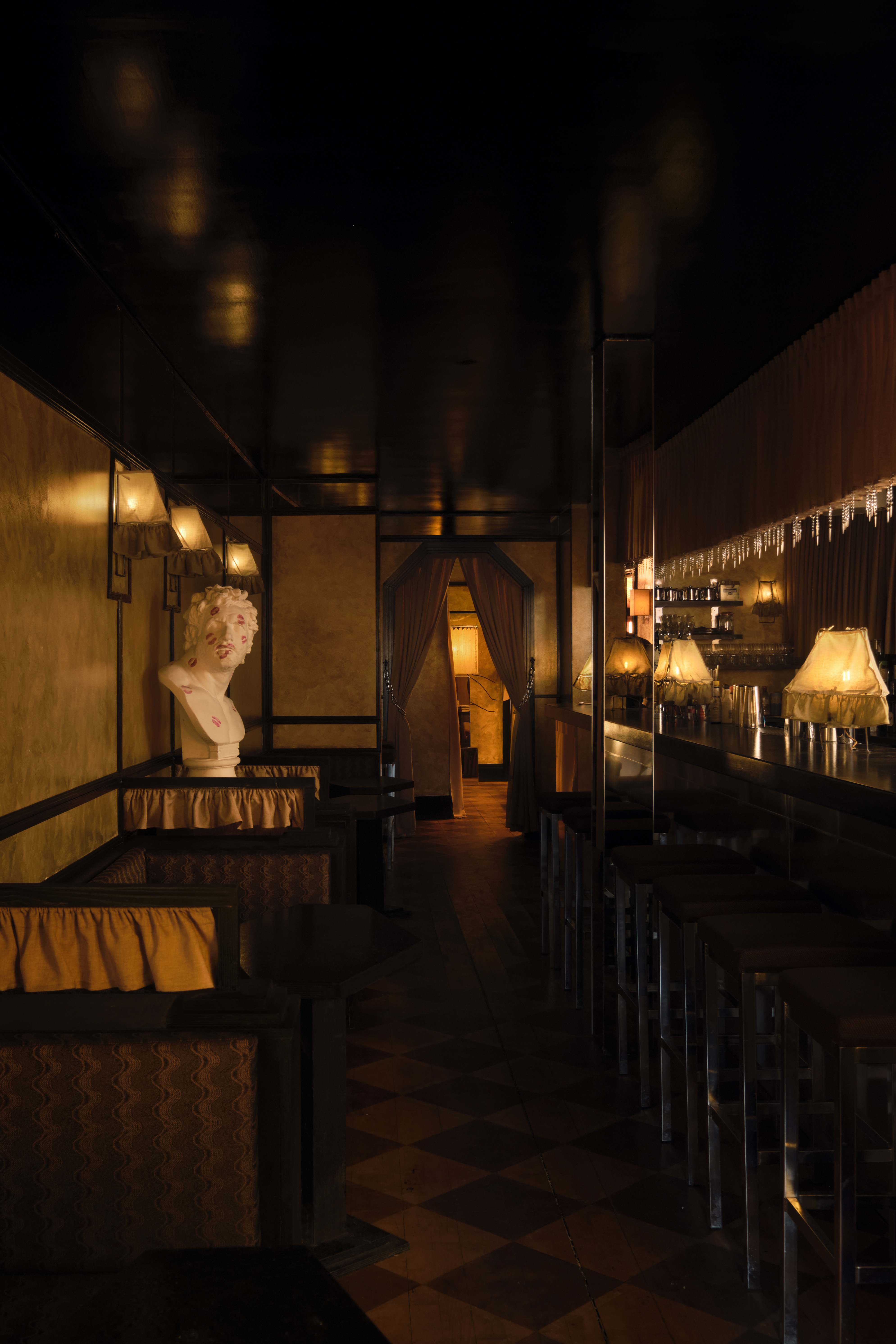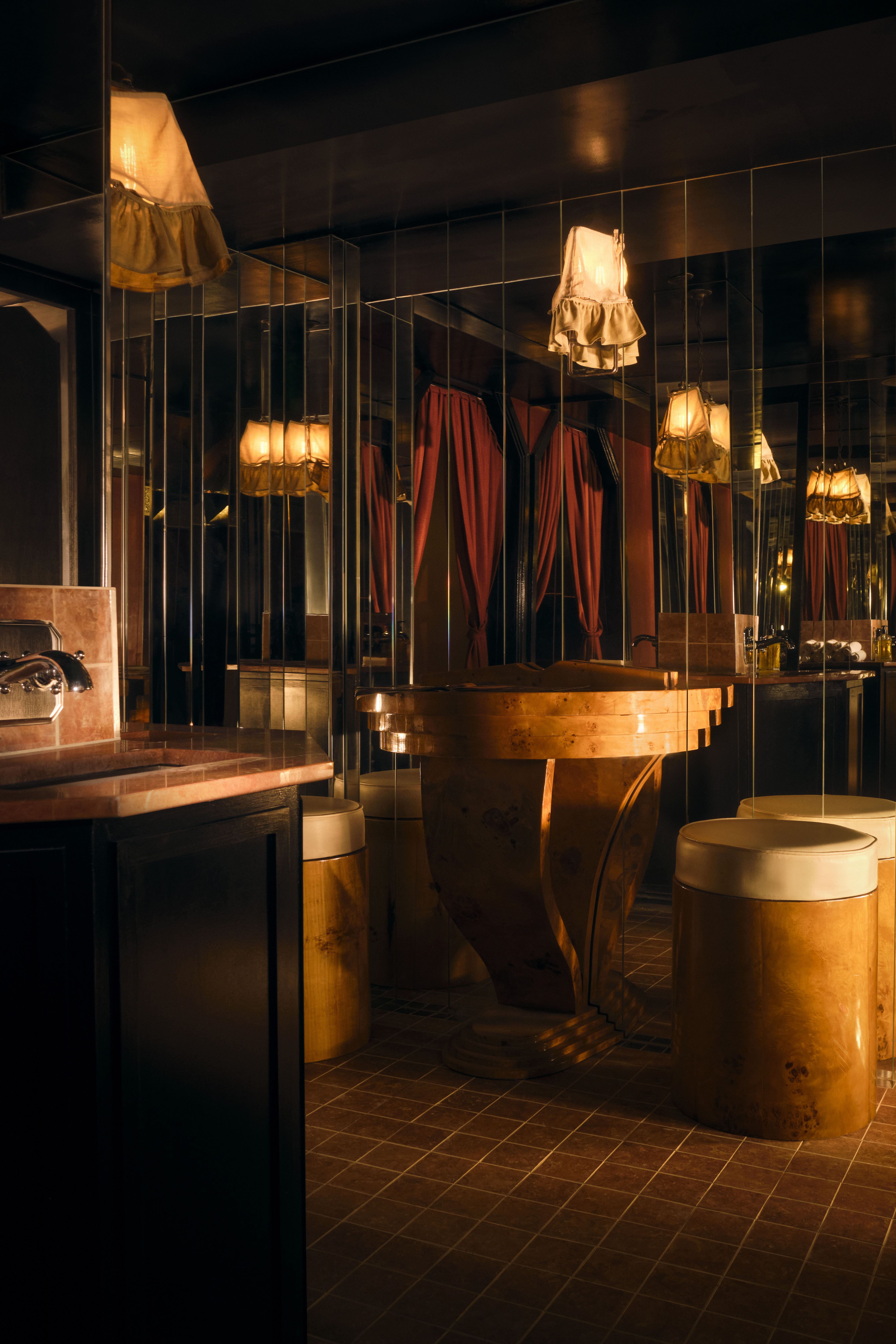 The club is a labyrinth of dimly lit, sensual spaces. Upstairs features a Viennese-inspired bar and chic cabaret performance area, while downstairs offers darker, more intimate rooms, including a bathhouse-inspired tiled dancefloor called “The Tank” and a fully mirrored central powder room. Unexpected pockets throughout encourage both group gatherings and intimate encounters.
