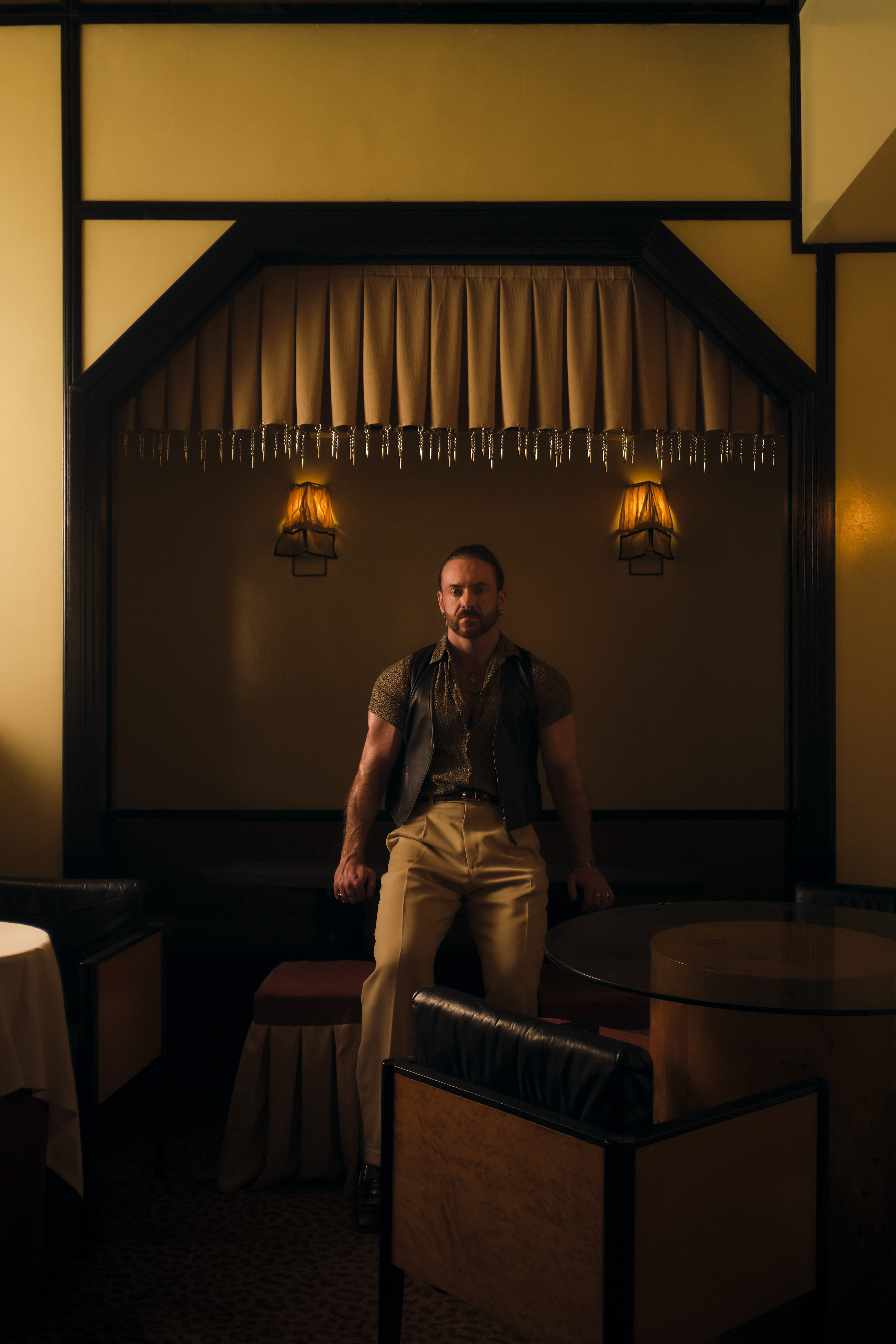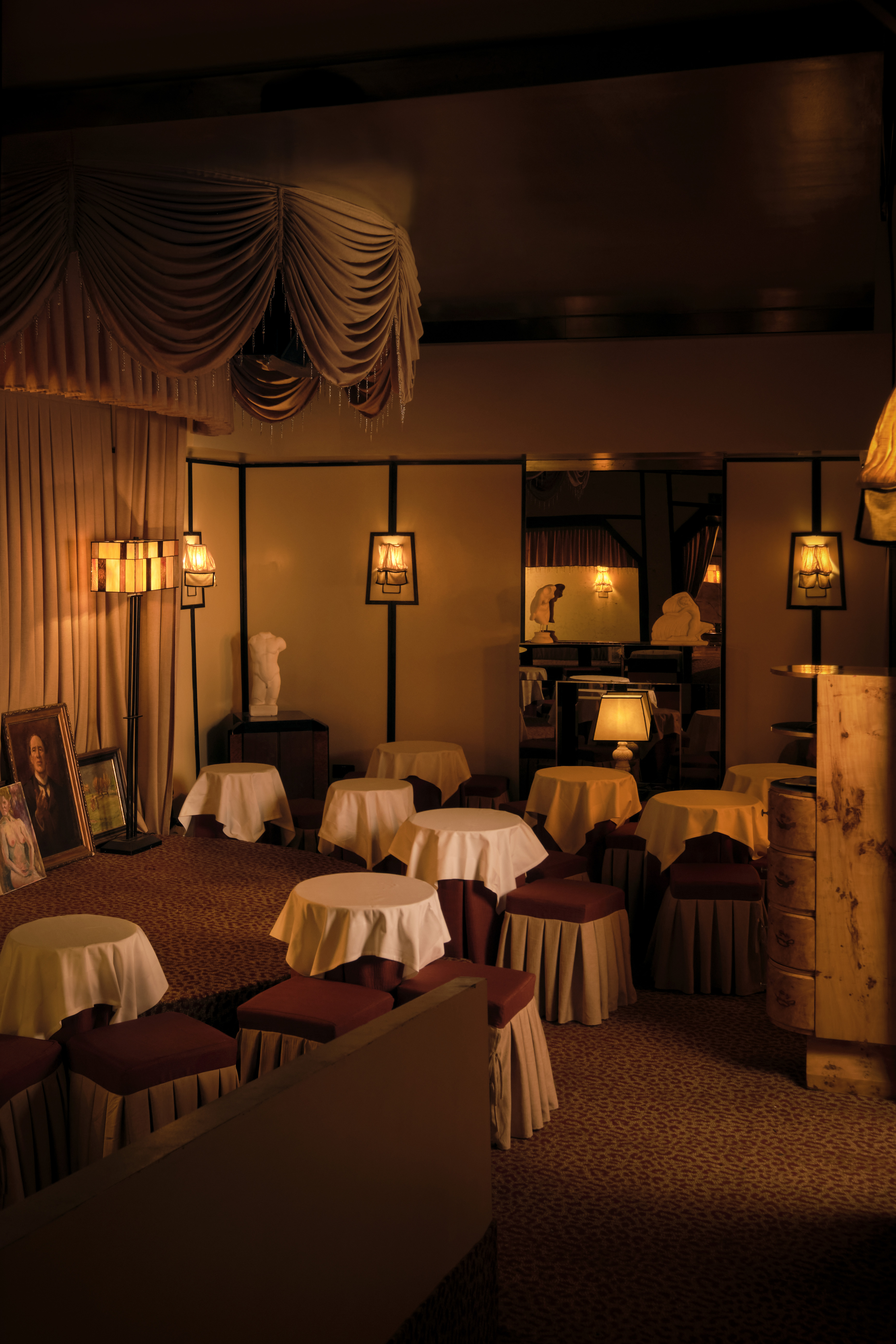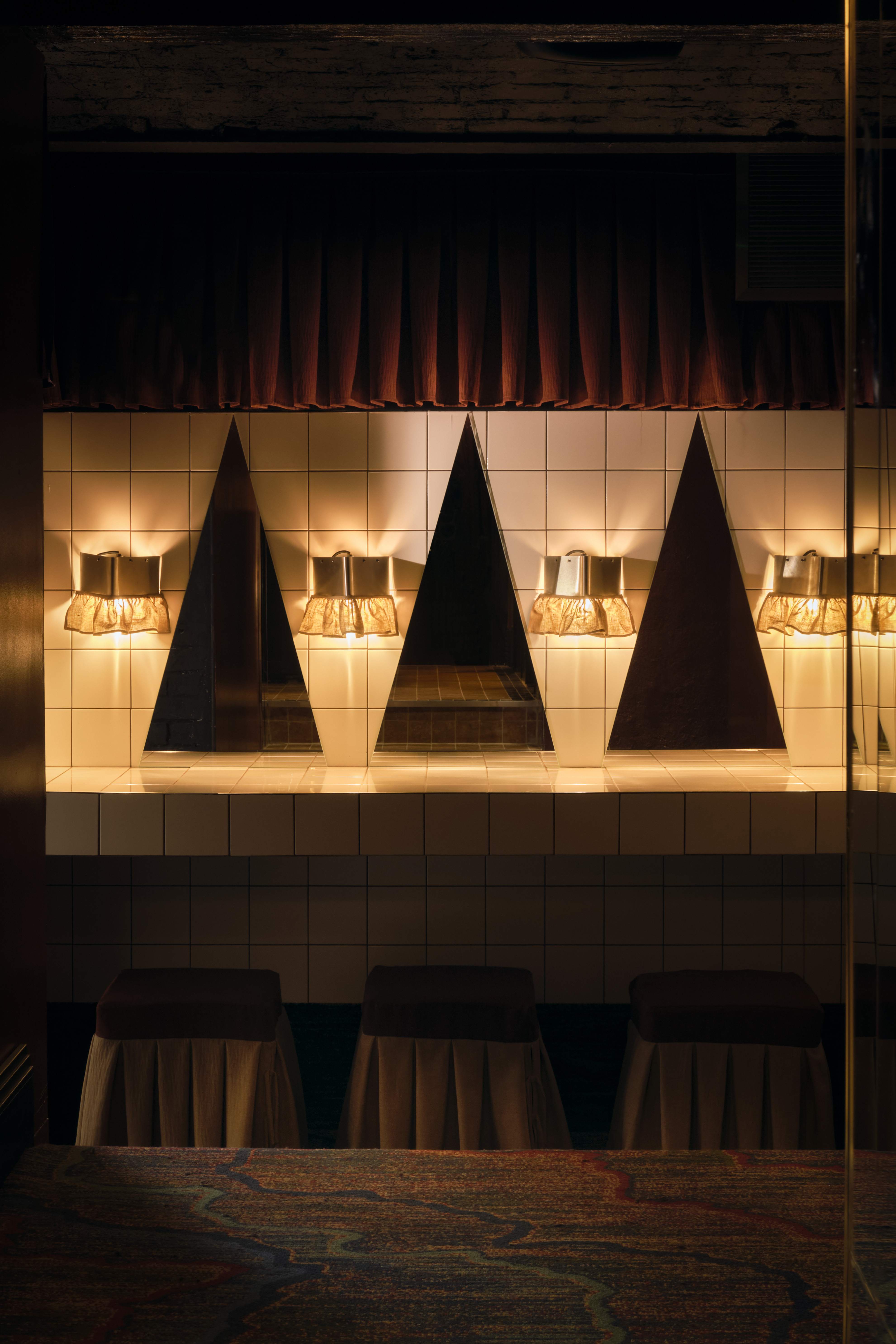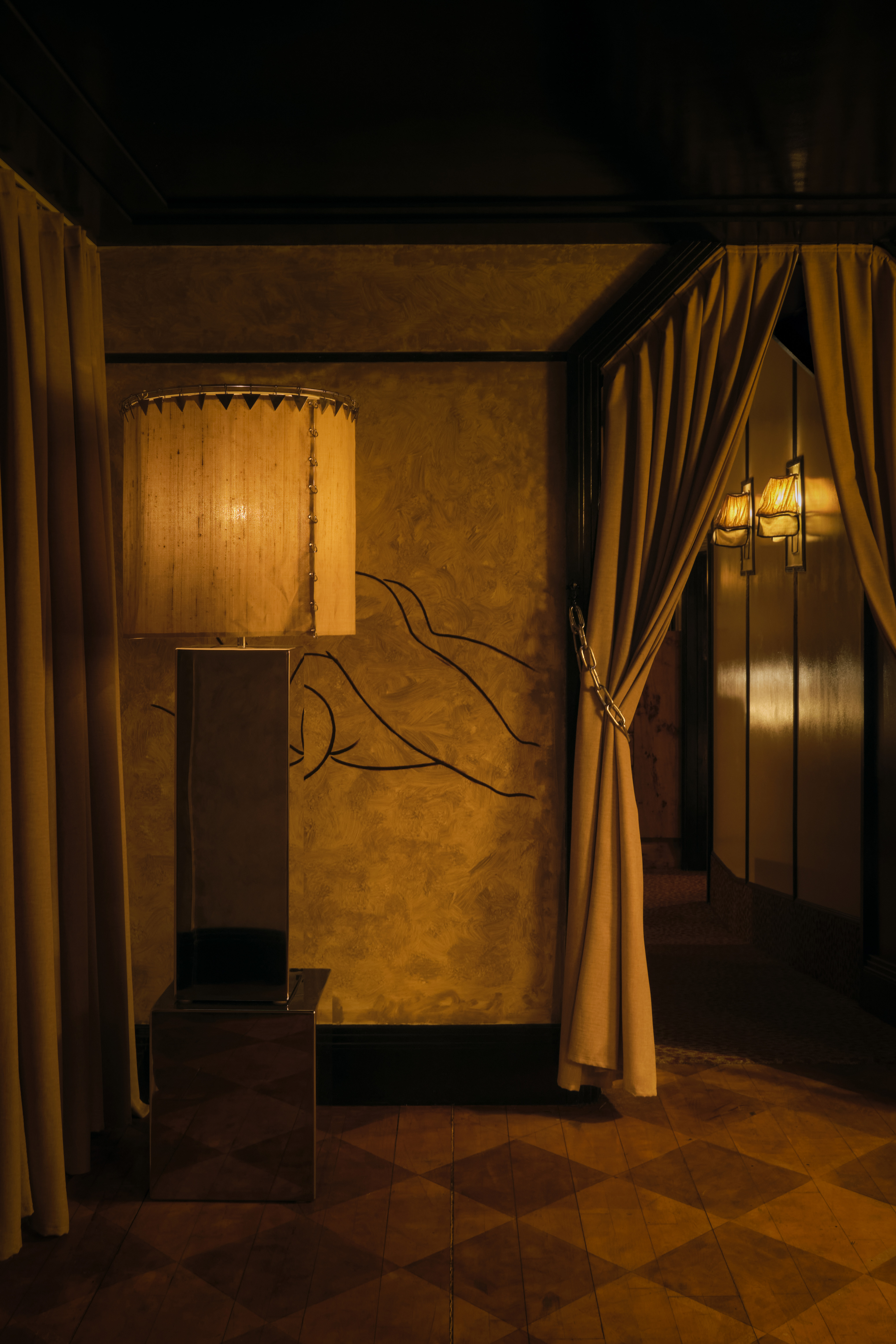 The club is a labyrinth of dimly lit, sensual spaces. Upstairs features a Viennese-inspired bar and chic cabaret performance area, while downstairs offers darker, more intimate rooms, including a bathhouse-inspired tiled dancefloor called “The Tank” and a fully mirrored central powder room. Unexpected pockets throughout encourage both group gatherings and intimate encounters.