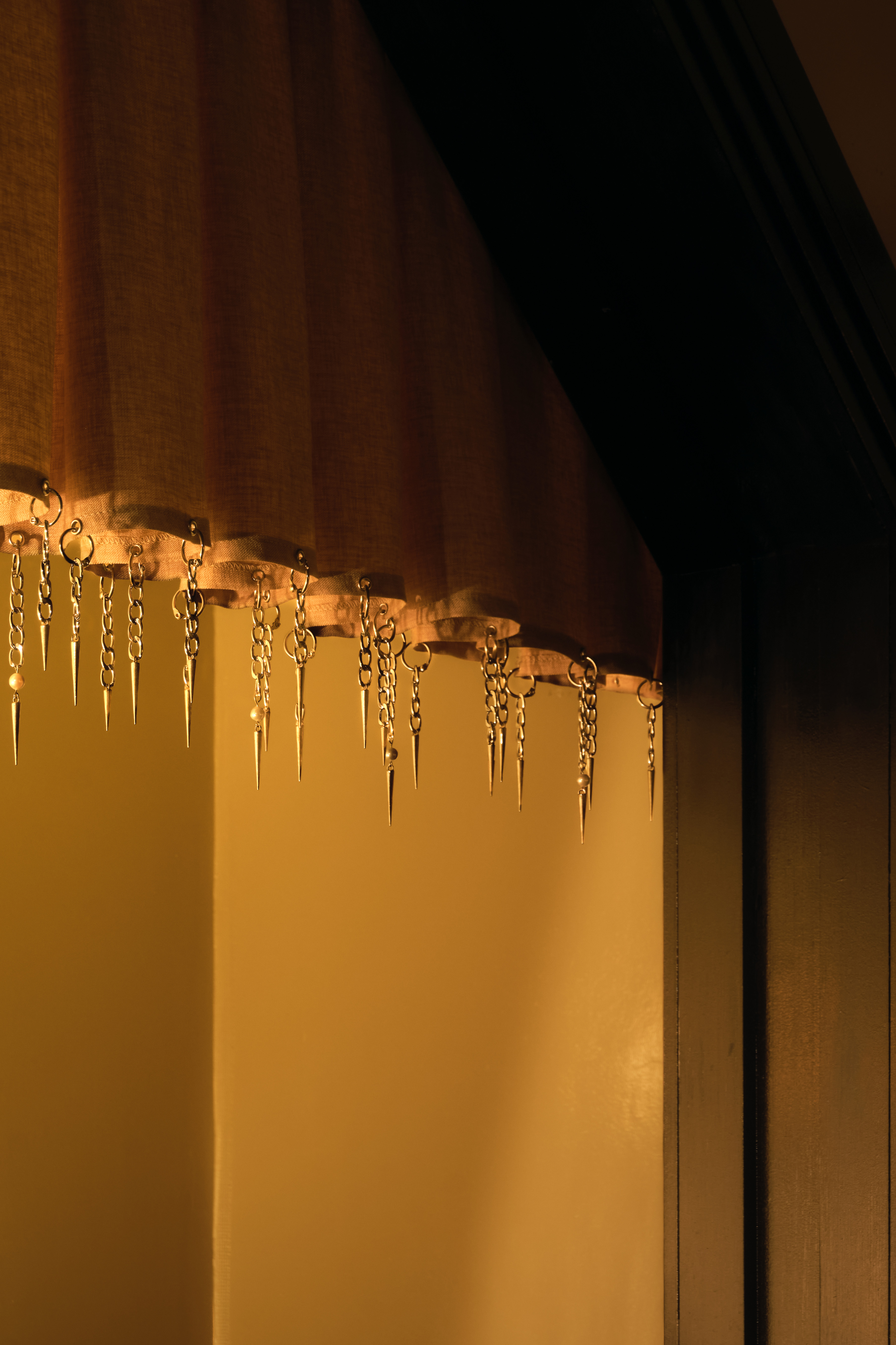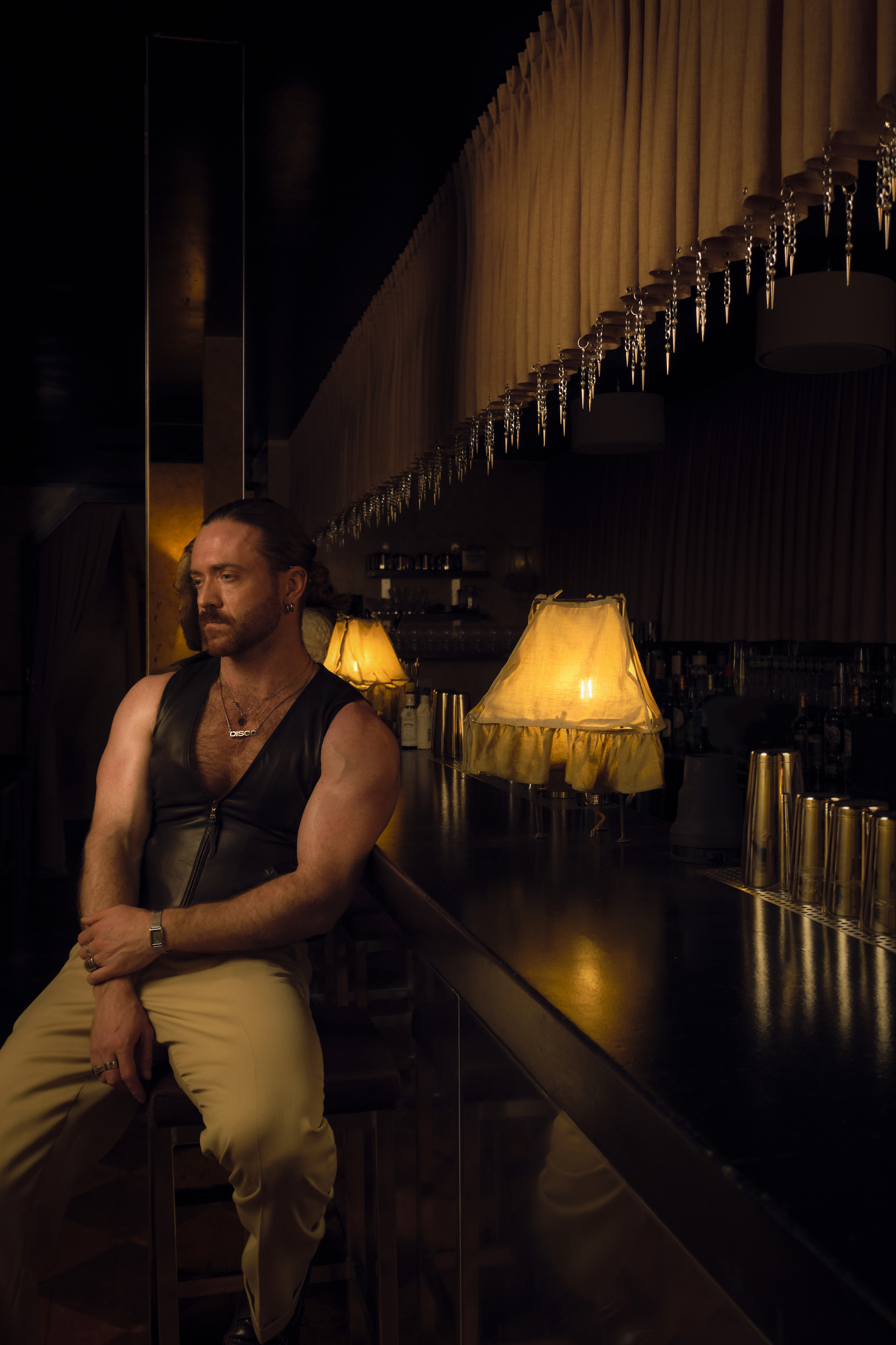 Referencing design movements from Wiener Werkstätte and Adolf Loos to Parisian cabaret, Yves Saint Laurent’s apartment, and Studio 54, the interior reinterprets these influences into a contemporary queer space. Stainless steel accents, deep red glossy walls, and heavy curtains create a cinematic atmosphere reminiscent of David Lynch or Wong Kar Wai.. Photos by Ollie G Tomlinson